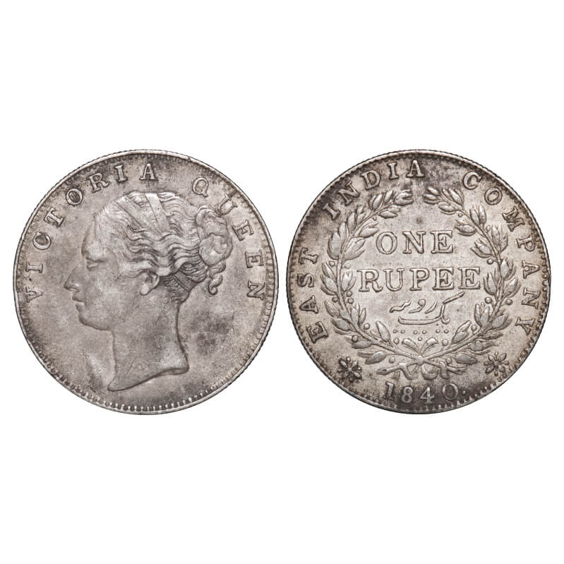 | Victoria Queen, Silver, Rupee, 1840, CL, Madras Mint, A/IV, 'S' incused & 'V' raised, English Head, With bud leaves above 'O' of One & with Two leaves above 'E' of One, Big 'V' within bottom ribbon bow, Wreath with 19 Berries (10L + 9R). F. Prid 47. GK 103. Extremely Fine, Toned. Very Rare. |