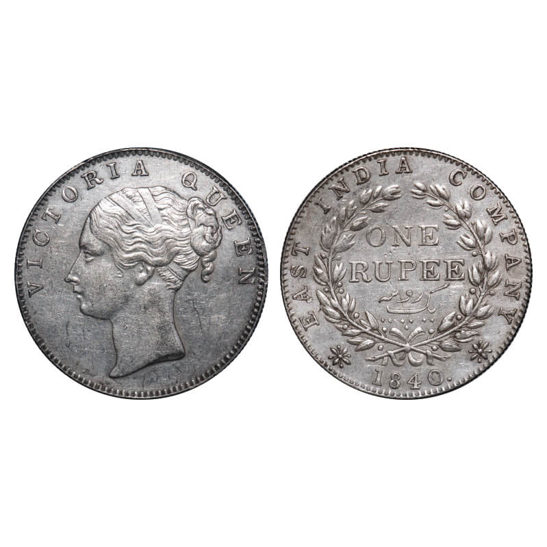 | Victoria Queen, Silver, Rupee, 1840, CL, Madras Mint, A/IV, Big 'S' incused & 'V' raised, English Head, With bud leaves above 'O' of One & with Two leaves above 'E' of One, 'V' within bottom ribbon bow, Wreath with 19 Berries (10L + 9R). F. Prid 47. GK 103. Extremely Fine+ with luster. Very Rare. |