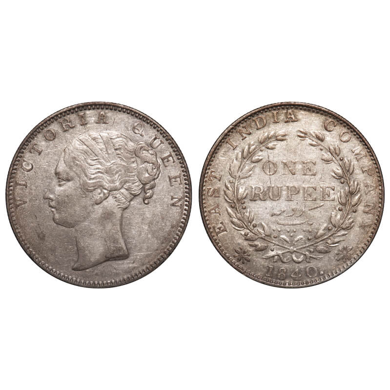| Victoria Queen, Silver, Rupee, 1840, CL, Madras Mint, A/IV, 'S' incused & 'V' raised, English Head, With bud leaves above 'O' of One and with Two leaves above 'E' of One, Wreath with 19 Berries (10L + 9R). F. Prid 47. GK 103. Extremely Fine+, Toned. Rare. |