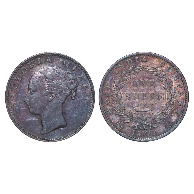 | Victoria Queen, Silver, Rupee, 1840, CL, Madras Mint, A/VII, 'S' incused, English Head, Wreath with 35 Berries (20L + 15R), With big Berry opposite 'O' of One, With horizontal letter 'M' raised on the end tip of the left side of ribbon bow. F. Prid Unlisted. GK 106. About Uncirculated, Toned. Very Scarce. |
