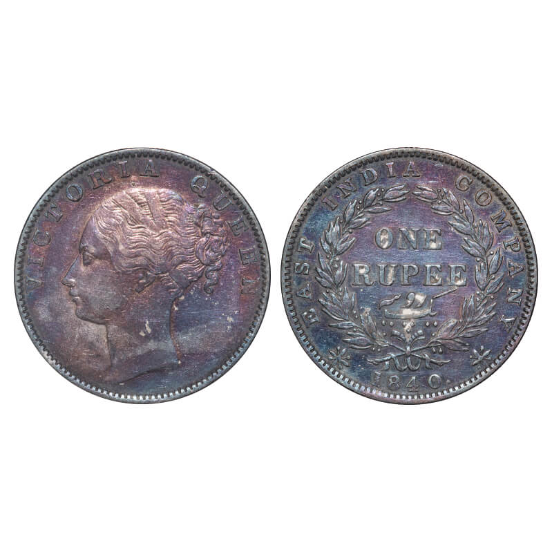 | Victoria Queen, Silver, Rupee, 1840, CL, Madras Mint, A/VII, 'S' incused, English Head, Wreath with 35 Berriews (20L + 15R), With big berry opposite 'O' of One, With horizontal letter 'M' raised on the end tip of the left side ribbon bow. F. Prid Unlisted. GK 106. Extremely Fine, Toned. Very Scarce. |