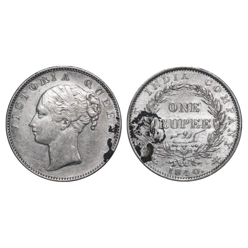 | Victoria Queen, Silver, Rupee, 1840, CL, Madras Mint, B/VII, 'S' incused, English Head with modified features, Wreath with 35 Berries (20L + 15R), With big berry opposite 'O' of One, With horizontal letter 'M' raised on the end tip of the left side of ribbon bow. F. Prid 50. GK 110. Very Fine+, Details. Very Scarce. |