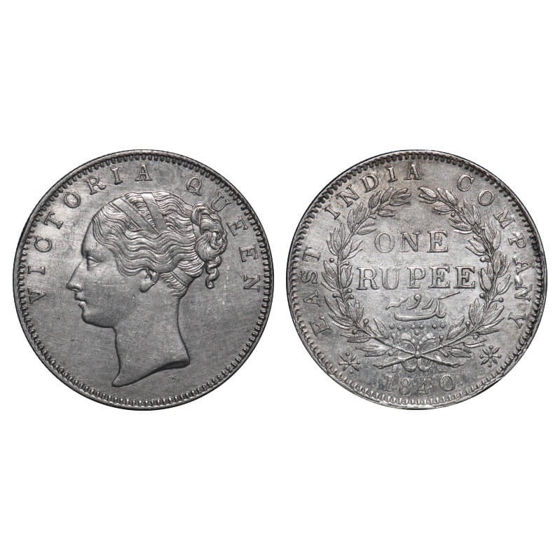 | Victoria Queen, Silver, Rupee, 1840, CL, Bombay Mint, A/I(i), English Head, With Two leaves above 'O' of One & with bud leaves above 'E' of One, Wreath with 19 Berries (10L + 9R), Die crack on Rev. F. Prid 51. GK 114. Extremely Fine+. Very Scarce. |
