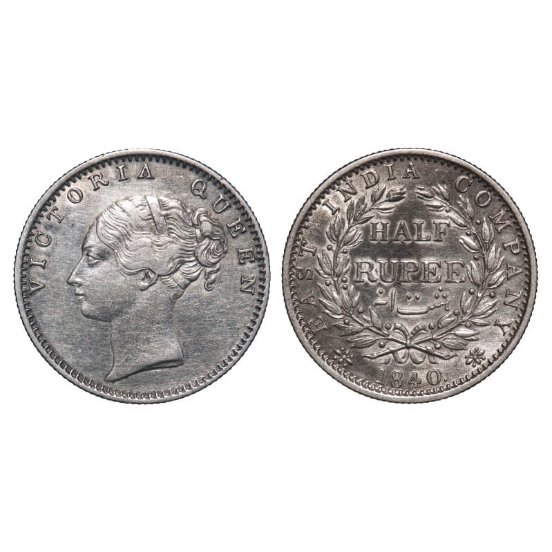 | Victoria Queen, Silver, Half Rupee, 1840, CL, Calcutta Mint, A/I, English Head, Fuller face, Broad neck, Two leaves above 'F' of Half, Wreath with 19 Berries (9L + 10R). F. Prid. 73. GK 119. Extremely Fine+. Rare. |