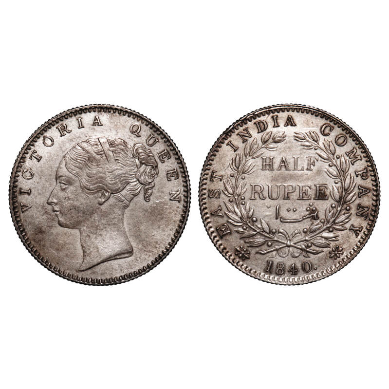 | Victoria Queen, Silver, Half Rupee, 1840, CL, Calcutta Mint, A/I, English Head, Fuller face, Broad neck, Two leaves above 'F' of Half, Wreath with 19 Berries (9L + 10R). F. Prid. 73. GK 119. About Uncirculated. Rare. |