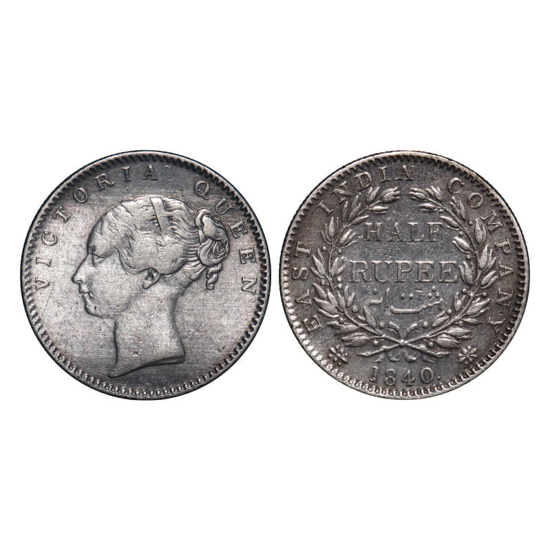| Victoria Queen, Silver, Half Rupee, 1840, CL, Bombay Mint, A/I, English Head, Wreath with 19 Berries (9L + 10R), With Two leaves above 'F' of Half. F. Prid 76. GK 123. Very Fine. Very Scarce. |