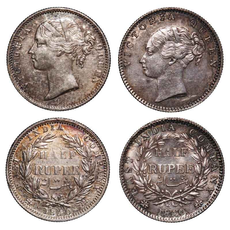 | Victoria Queen, Silver, Half Rupee, (2 coins), 1840, 1) CL, Bombay Mint, A/I, English Head, Fuller face, Broad neck, Wreath with 19 Berries (9L + 10R), Two leaves above 'F' of Half, 2) DL, Calcutta Mint, .W.W incused, Wreath with 24 Berries (12L + 12R), Vertical stroke of both E's in Queen short. F. Prid 76, 80. GK 123, 188. Very Fine+ to Extremely Fine. Scarce. |