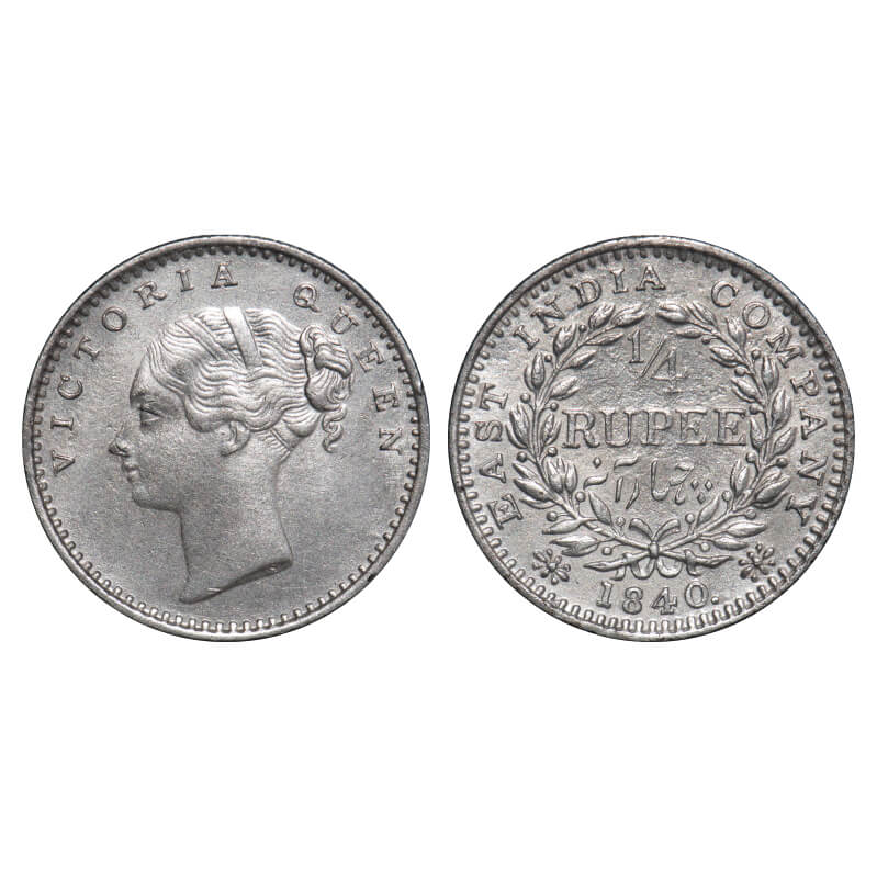 | Victoria Queen, Silver, 1/4 Rupee, 1840, CL, Madras Mint, A(a)/I, 'S' incused and 'V' raised, Normal S. F. Prid 101. GK 129. Very Fine+. Very Scarce. |