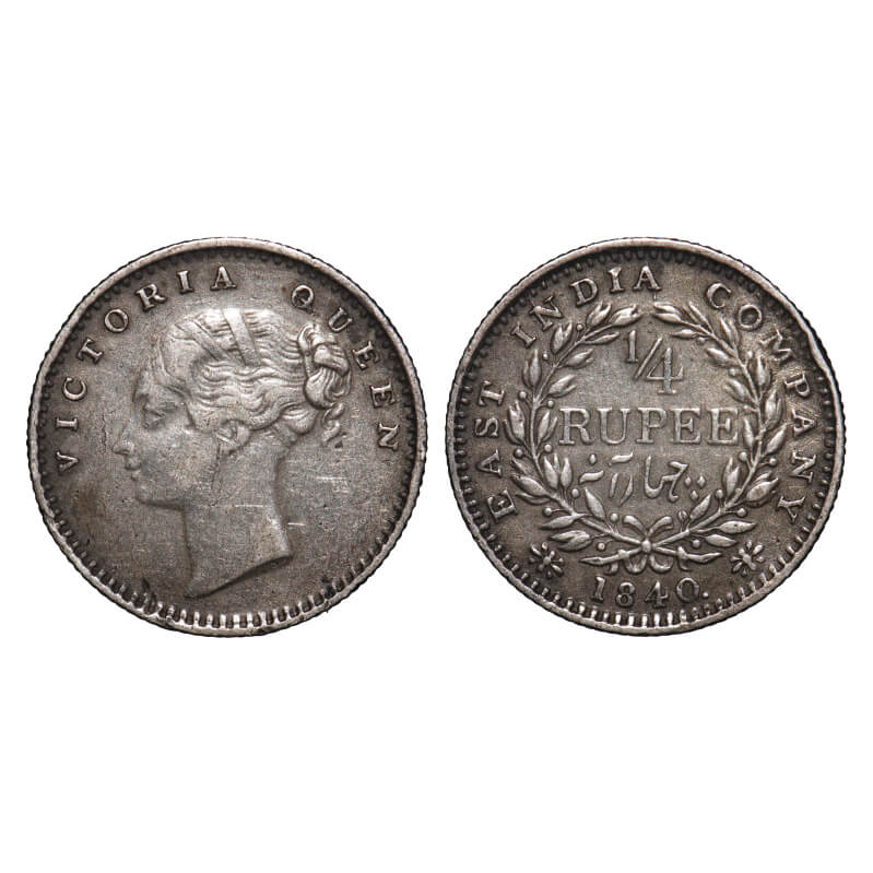 | Victoria Queen, Silver, 1/4 Rupee, 1840, CL, Madras Mint, A(a)/I, 'S' incused & 'V' raised, Normal 'S', English Head, w/o curl on cheek, Wreath with 20 Berries (10L + 10R), Numeral 4 with serif pointing upwards. F. Prid 102. GK 129. Very Fine+. Very Scarce. |