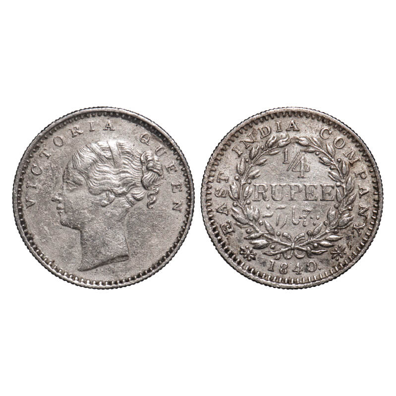 | Victoria Queen, Silver, 1/4 Rupee, 1840, CL, Bombay Mint, A(b)/I, English Head, With single curl of hair on second top hair band, Numeral 4 with serif pointing upwards, Wreath with 20 Berries (10L + 10R). F. Prid. 102. GK 132. Very Fine. Very Scarce. |