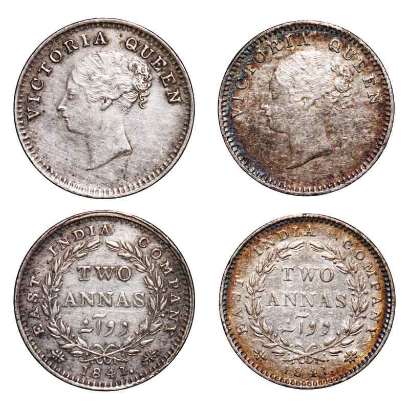 | Victoria Queen, Silver, 2 Annas, (2 coins), 1841, CL, 1) Calcutta Mint, A(a)/I, Plain edge, With curl of hairs on 1st hair band, Wreath with 16 Berries (8L + 8R), 2) Madras Mint, A(a)/I, 'S' incused & 'V' raised, Plain edge, With curl of hairs on 1st hair band, Wreath with 16 Berries (8L + 8R), 'S' incused at the truncation of Queens neck, 'V' raised at the bottom Right portion of the ribbon bow on the Rev. F. Prid 115, 118. GK 135, 138. Very Fine+ to Extremely Fine. Very Scarce. |