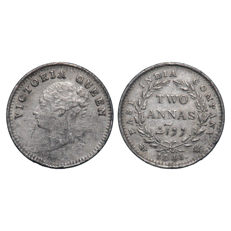 | Victoria Queen, Silver, 2 Annas, 1841, CL, Madras Mint, A(a)/I, 'S' incused & 'V' raised, With curl of hairs on 1st hair band, Plain edge, Wreath with 16 Berries (8L + 8R). F. Prid 118. GK 138. About Extremely Fine. Rare. |
