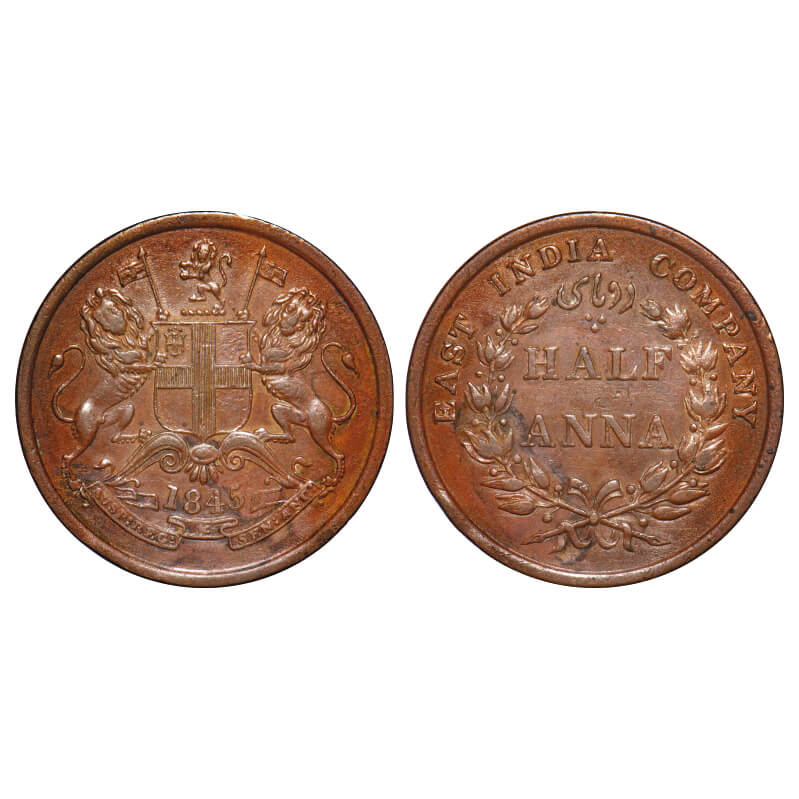 Victoria Queen, Copper, Half Anna, 1845, Calcutta Mint, Obv B, Cross bar of numeral 4 w/o serif, Wreath with 19 Berries (10L + 9R). F. Prid 138. GK 145. Extremely Fine+. Very Scarce.
