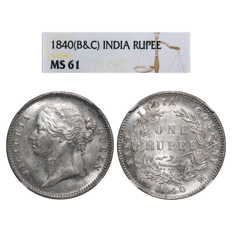 | Victoria Queen, Silver, Rupee, 1840, DL, Calcutta Mint, W.W. raised, Wreath with 28 Berries (13L + 15R), w/o serif pointing upwards, Numeral 4 with thin short cross bar, W.W. raised double strucked. F. Prid. Unlisted. GK Unlisted. NGC Slabbed MS 61. Very Rare. |