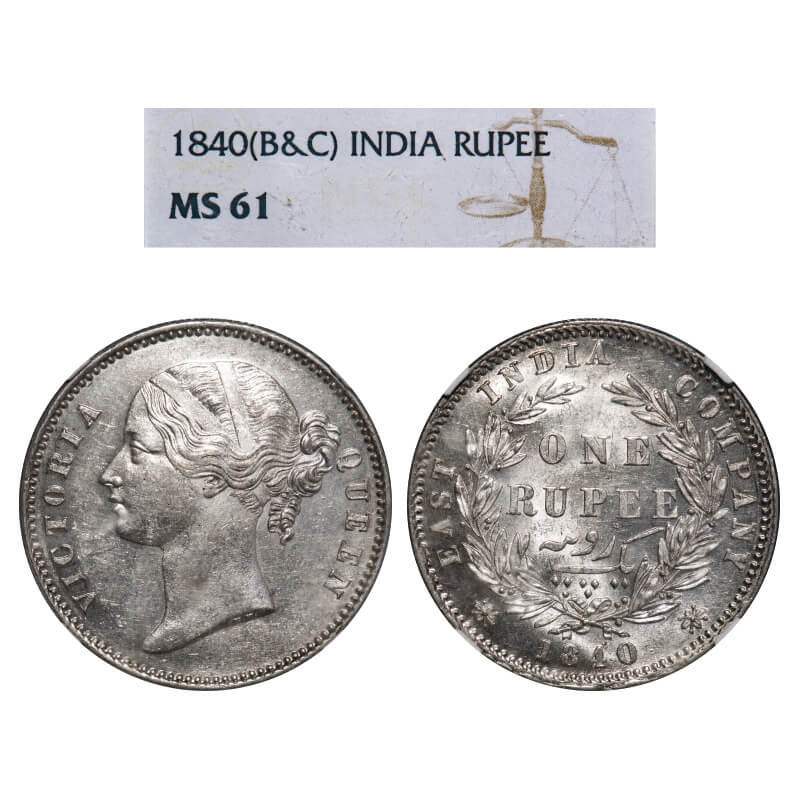 | Victoria Queen, Silver, Rupee, 1840, DL, Calcutta Mint, W.W. raised, Wreath with 28 Berries (13L + 15R), With thick cross bar in numeral 4, Numeral 4 is big sized. F. Prid. Unlisted. GK Unlisted. NGC Slabbed MS 61. Very Rare. |