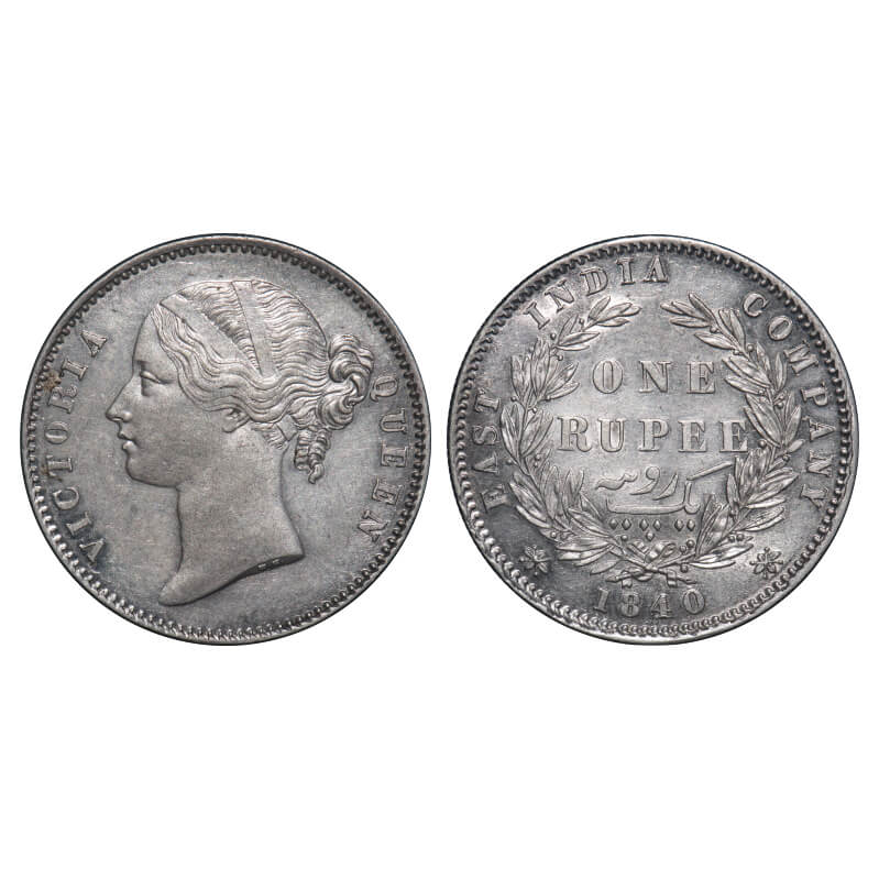 Victoria Queen, Silver, Rupee, 1840, DL, Calcutta Mint, W.W. raised, Wreath with 28 Berries (13L + 15R). F. Prid 56. GK 163. About Uncirculated. Very Scarce.