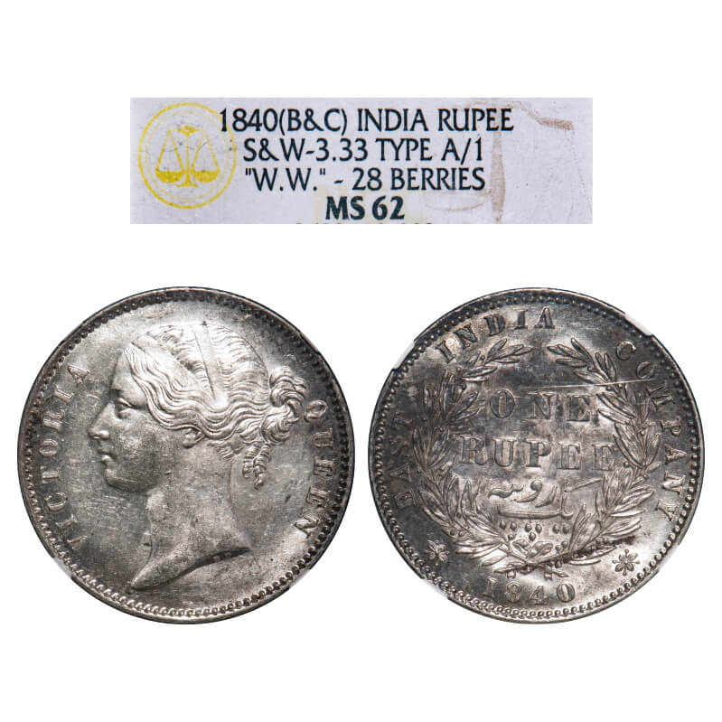 | Victoria Queen, Silver, Rupee, 1840, DL, Calcutta Mint, W.W. raised, Wreath with 28 Berries (13L + 15R), Rev Toned. F. Prid 56. GK 163. NGC Slabbed MS 62. Very Rare. |