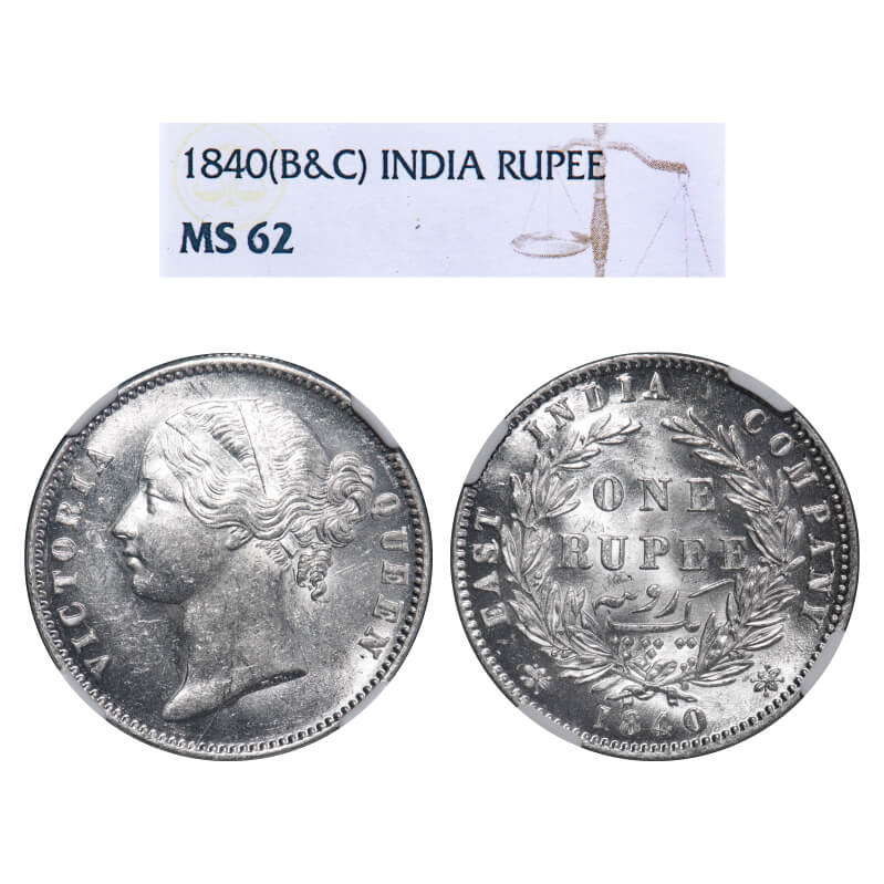 | Victoria Queen, Silver, Rupee, 1840, DL, Calcutta Mint, W.W. raised, Wreath with 28 Berries (13L + 15R), Few strands re touched re engraving of hairs connecting hair lock on Obv. F. Prid 56. GK 163. NGC Slabbed MS 62. Very Rare. |