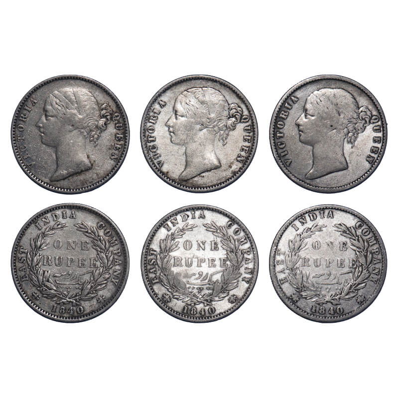 | Victoria Queen, Silver, Rupee, (3 coins), 1840, DL, 1 & 2) Calcutta Mint, W.W. raised, Wreath with 28 Berries (13L + 15R), 3) Calcutta Mint, W.W. raised, Wreath with 28 Berries (13L + 15R), Re-engraving of hairs connecting hair lock. F. Prid 56(2), 56. GK 163(2), 167. Very Fine. Very Scarce. |