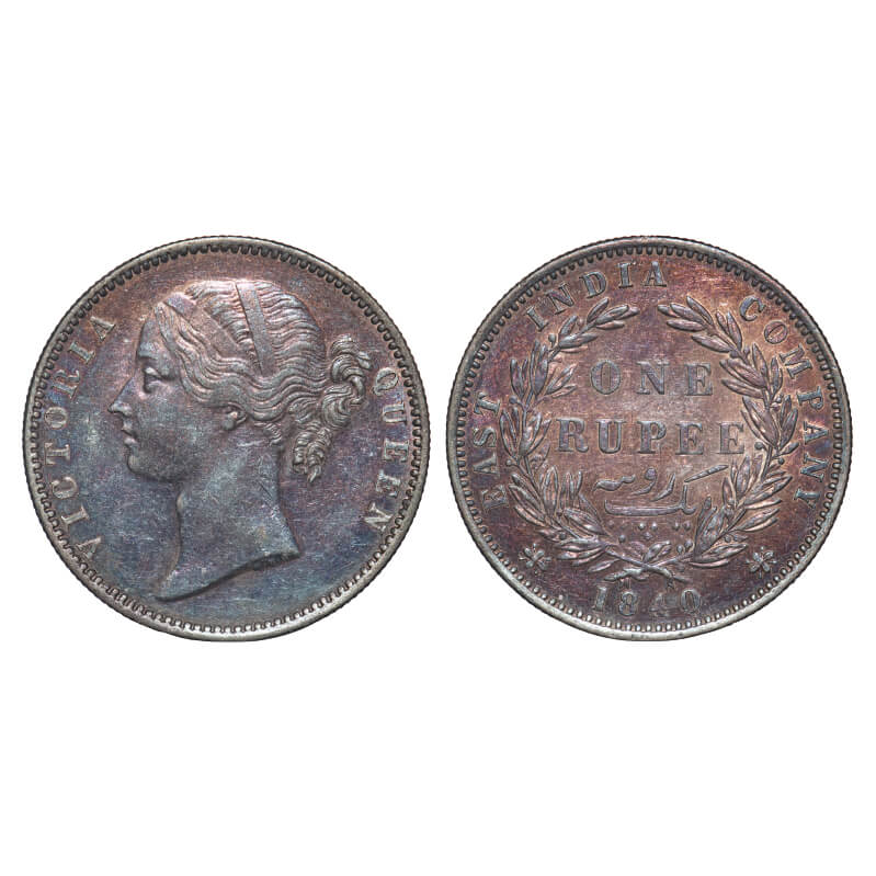 | Victoria Queen, Silver, Rupee, 1840, DL, Madras Mint, W.W. R raised, Wreath with 28 Berries (13L + 15R), 'B' broken at bottom, Resembles like 'R'. F. Prid Unlisted. GK 174. Almost Uncirculated, Toned. Rare. |