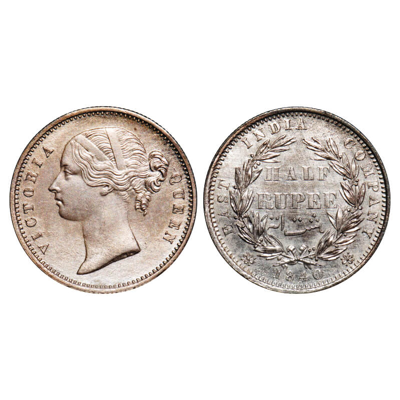 | Victoria Queen, Silver, Half Rupee, 1840, DL, Calcutta Mint, .W.W incused, Wreath with 24 Berries (12L + 12R), Vertical stroke connecting centre arm of the both E's in Queen long. F. Prid 80. GK 189. About Uncirculated. Rare. |