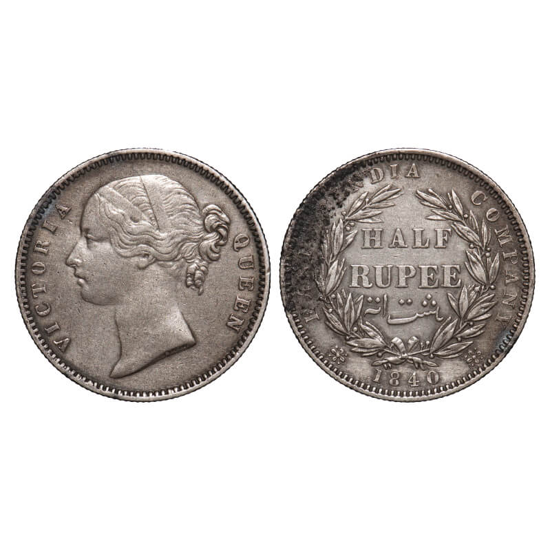 | Victoria Queen, Silver, Half Rupee, 1840, DL, Madras Mint, 'B' raised, W.W. incused, Wreath with 24 Berries (12L + 12R), Initial 'B' often looks like numeral 8. F. Prid. Unlisted. GK 196. Extremely Fine+. Rare. |