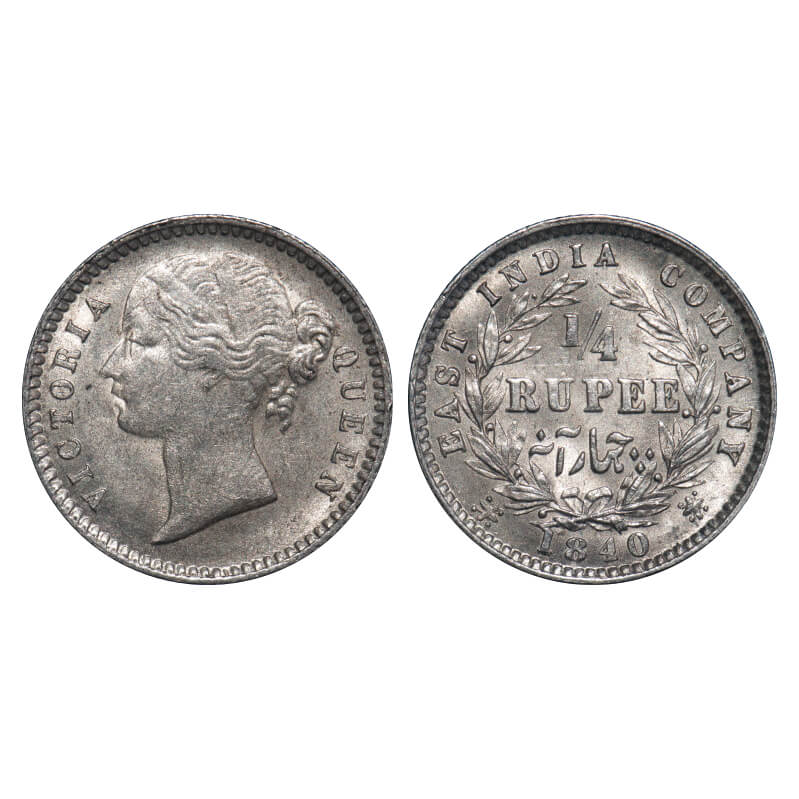 | Victoria Queen, Silver, 1/4 Rupee, 1840, DL, Calcutta Mint, W.W. raised, Wreath with 10 Berries (6L + 4R), Short cross bar of numeral 4. F. Prid 105. GK 198. About Uncirculated. Rare. |