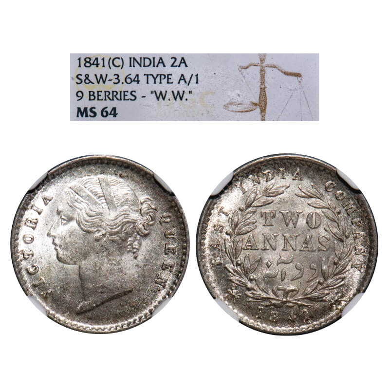 | Victoria Queen, Silver, 2 Annas, 1841, DL, Calcutta Mint, W.W. raised, Year numerals 1841 has more space in between, Wreath with 9 Berries (5L + 4R). F. Prid 121. GK 216. NGC Slabbed MS 64. Very Rare. |
