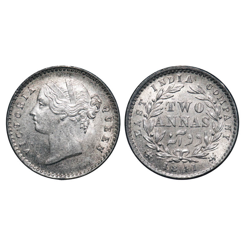| Victoria Queen, Silver, 2 Annas, 1841, DL, Calcutta Mint, W.W. raised, Year numerals 1841 has more space in between, Wreath with 9 Berries (5L + 4R). F. Prid 121. GK 216. Uncirculated. Rare. |
