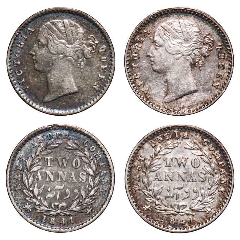 | Victoria Queen, Silver, 2 Annas, (2 coins), 1841, DL, Calcutta Mint, W.W. raised, Year numerals 1841 has more space in between, Wreath with 9 Berries (5L + 4R). F. Prid 121(2). GK 216(2). Very Fine+ to Extremely Fine+. Very Scarce. |