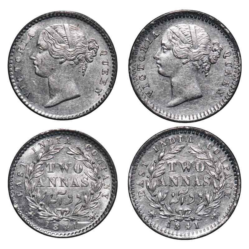 | Victoria Queen, Silver, 2 Annas, (2 coins), 1841, DL, 1) Calcutta Mint, W.W. raised, Year numerals 1841 has more space in between, Wreath with 9 Berries (5L + 4R), 2) Madras Mint, W.W. raised, 'S' incused, Wreath with 9 Berries (5L + 4R) (jumping 4). F. Prid 121, 125. GK 216, 219. Extremely Fine to Uncirculated. Very Scarce. |