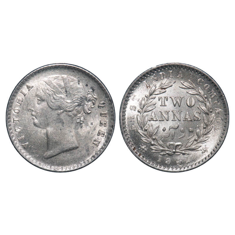 | Victoria Queen, Silver, 2 Annas, 1841, DL, Calcutta Mint, W.W. raised, Wreath with 9 Berries (5L + 4R), Small 'C' & 'O' in Victoria. F. Prid 121 Type. GK 216 Type. Almost Uncirculated. Rare. |