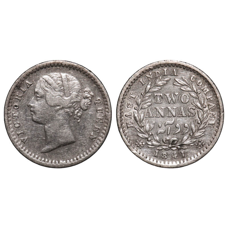 | Victoria Queen, Silver, 2 Annas, 1841, DL, Madras Mint, 'S' incused, W.W. raised, Wreath with 9 Berries (5L + 4R). F. Prid 125. GK 219. Extremely Fine+. Rare. |