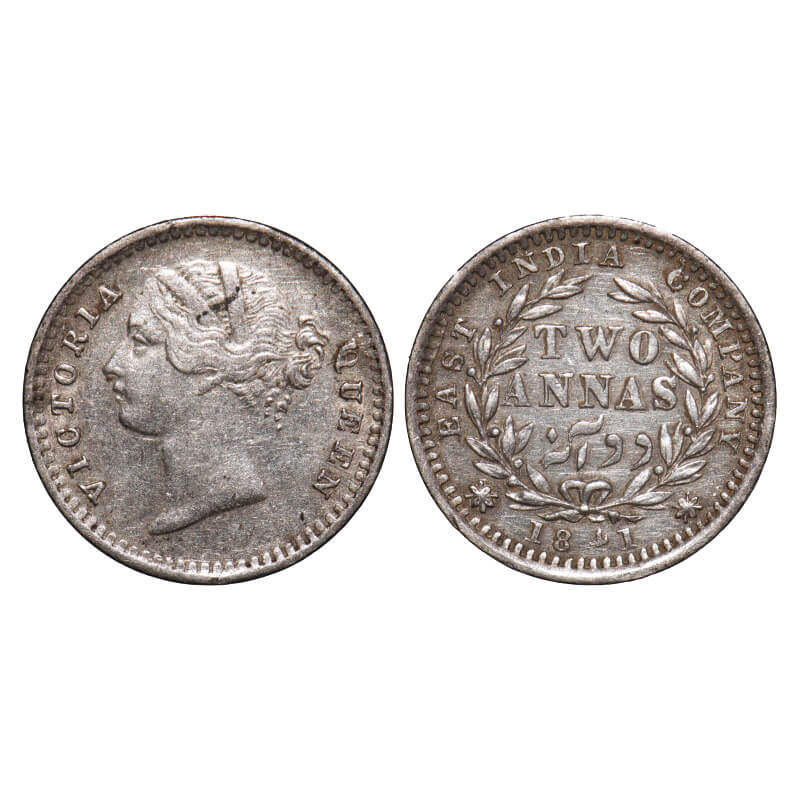 | Victoria Queen, Silver, 2 Annas, 1841, DL, Bombay Mint, .W.W raised, Wreath with 9 Berries (5L + 4R), Broken horizontal stroke of numeral 4. F. Prid Unlisted. GK 225. Extremely Fine. Rare. |