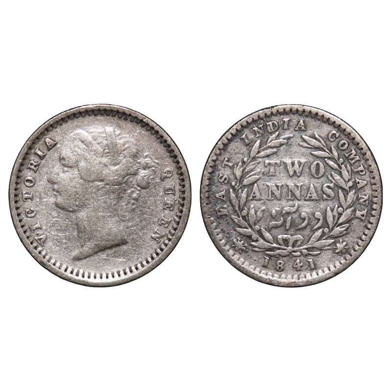 | Victoria Queen, Silver, 2 Annas, 1841, DL, Bombay Mint, W.W. raised, Wreath with 9 Berries (5L + 4R), No re-engraving of hairs connecting hair lock, Variety. F. Prid 128 Type. GK 225 Type. Very Fine. Very Scarce. |