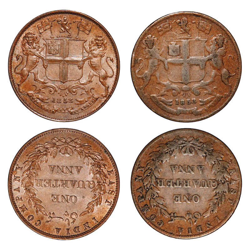 | Victoria Queen, Copper, Quarter Anna, (2 coins), 1858, 1) J. Watt & Co., Birmingham Mint, Single leaf, Year numerals closer from the above 5 line design, Rev inverted, 2) R. Heaton & Sons., Birmingham Mint, Two leaves, Rev Inverted. F. Prid 156, 154. GK 231, 233. Very Fine to Uncirculated. Very Scarce. |