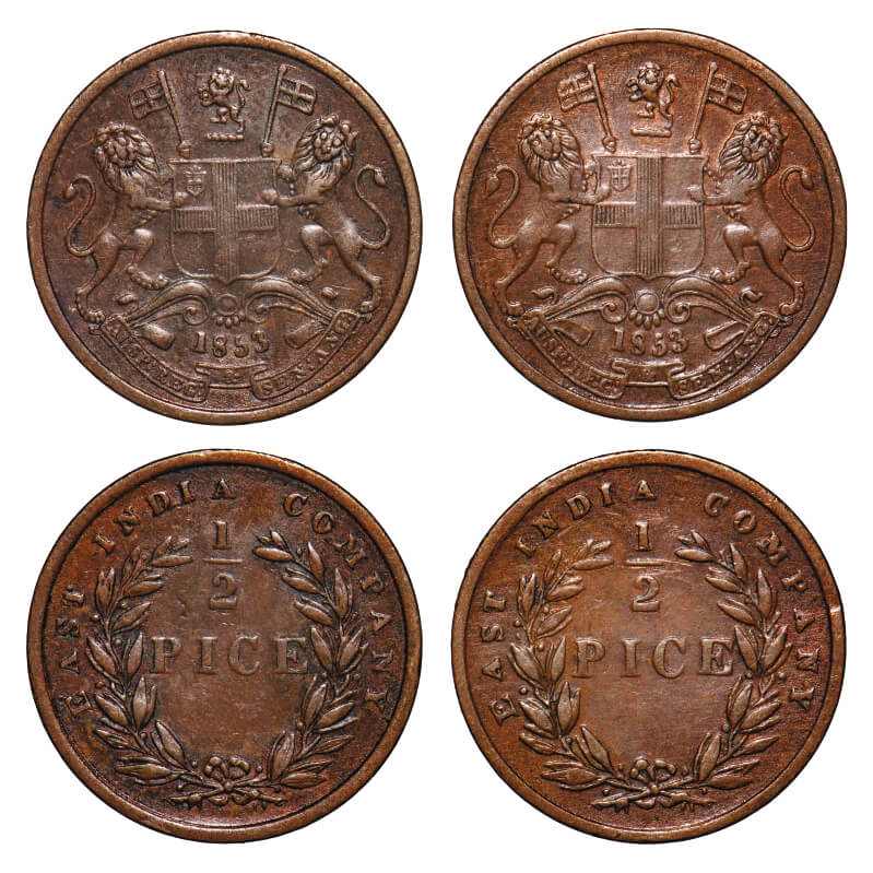 | Victoria Queen, Copper, 1/2 Pice, (2 coins), 1853, Calcutta Mint, Wreath with 19 Berries (10L + 9R), 1) A/I, Rounded beads above year numerals, Thick numerals, 2) Elongated beads above year numerals, Thin numerals. F. Prid 159, 159. GK 234, 235. Very Fine+ to Extremely Fine. Very Scarce. |