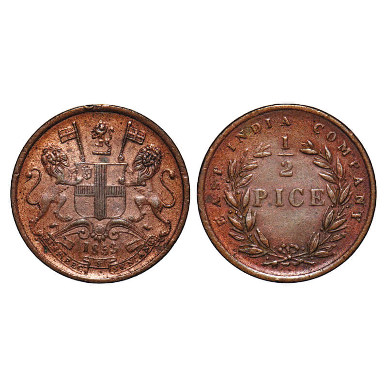 Victoria Queen, Copper, 1/2 Pice, 1853, Calcutta Mint, B/I, Elongated beads above year numerals, Wreath with 19 Berries (10L + 9R). F. Prid 159. GK 235. About Uncirculated. Very Scarce.