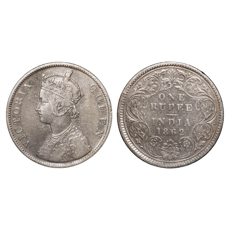 Victoria Queen, Silver, Rupee, 1862, Calcutta Mint, B/III, Embroidery in high relief. F. Prid 60. GK 243. Very Fine+. Very Scarce.