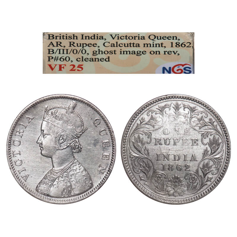 | Victoria Queen, Silver, Rupee, 1862, Calcutta Mint, B/III, Embroidery in high relief, Ghost image on Rev mentioned on the slab. F. Prid 60. GK 243. NGS Slabbed VF 25, Cleaned. Very Scarce. |