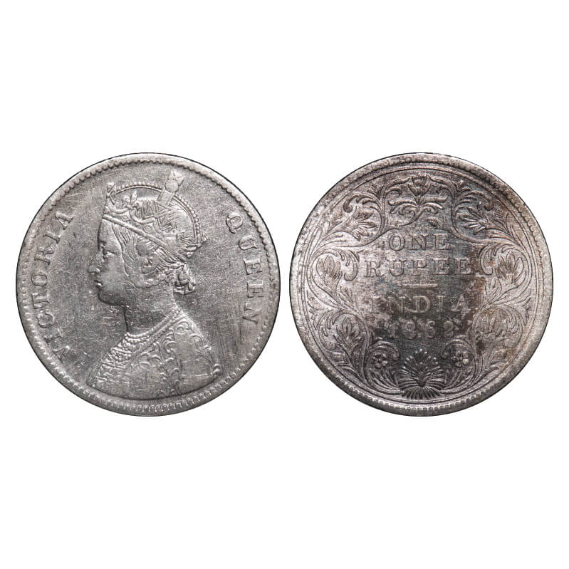 | Victoria Queen, Silver, Rupee, 1862, Calcutta Mint, A/II(i), With initial 'J'. With Pineapple like buds at 4 different places, 3 Pineapple buds above 'O' 'N' & 'E' of One, 1 Pineapple bud above 2nd 'E' of Rupee. F. Prid 62. GK 244. Very Fine. Very Scarce. |