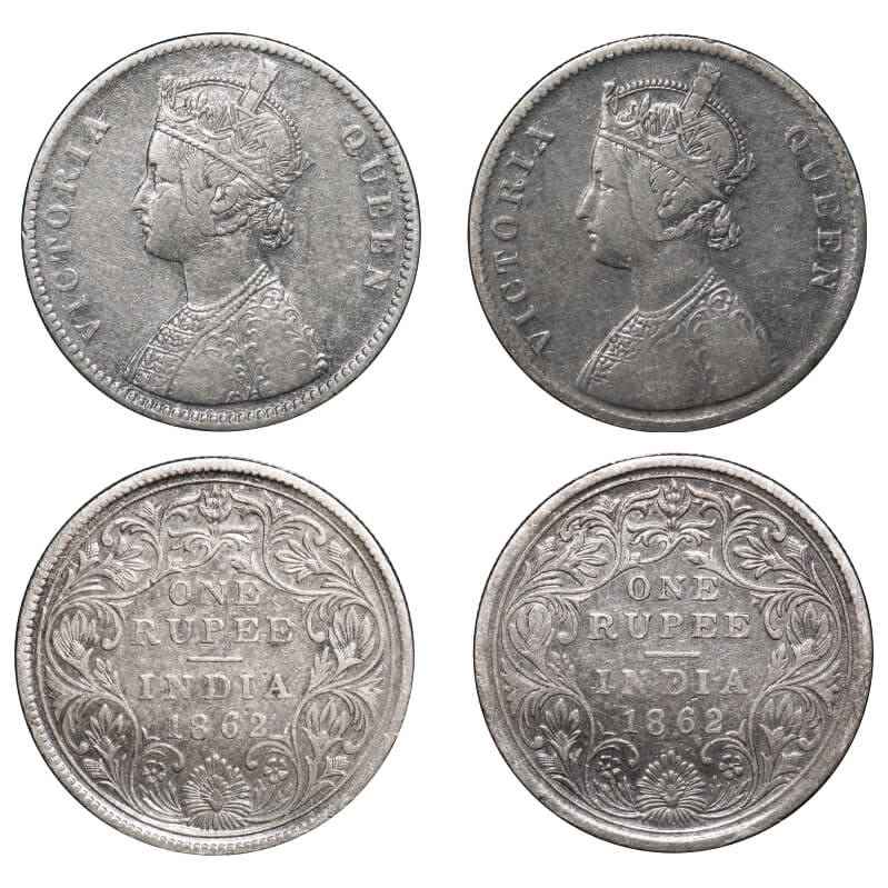 | Victoria Queen, Silver, Rupee, (2 coins), 1862, Calcutta Mint, A/II(i), With Pineapple like buds at 4 different places, 3 Pineapple buds above 'O', 'N' & 'E' of One, 1 Pineapple bud above 2nd 'E' of Rupee, 1) With initial 'J', 2) w/o initial 'J'. F. Prid 62(2) 62, GK 244, 245. Very Fine to Very Fine+. Very Scarce. |