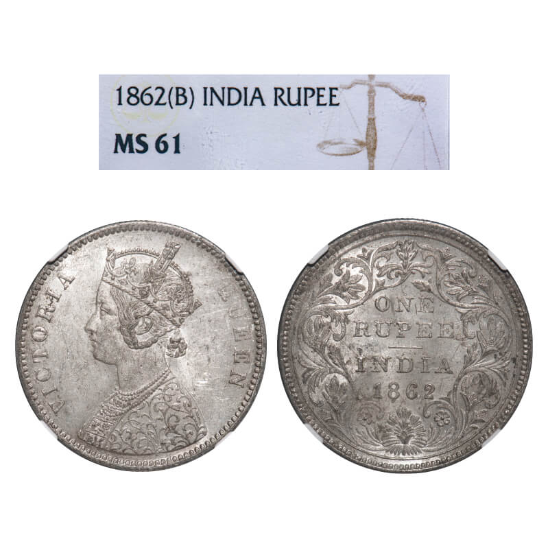 Victoria Queen, Silver, Rupee, 1862, Calcutta Mint, A/II, w/o initial 'J', The coin slab mentions Bombay Mint but this is a Calcutta mint coin. F. Prid 64. GK 252. NGC Slabbed MS 61. Rare.