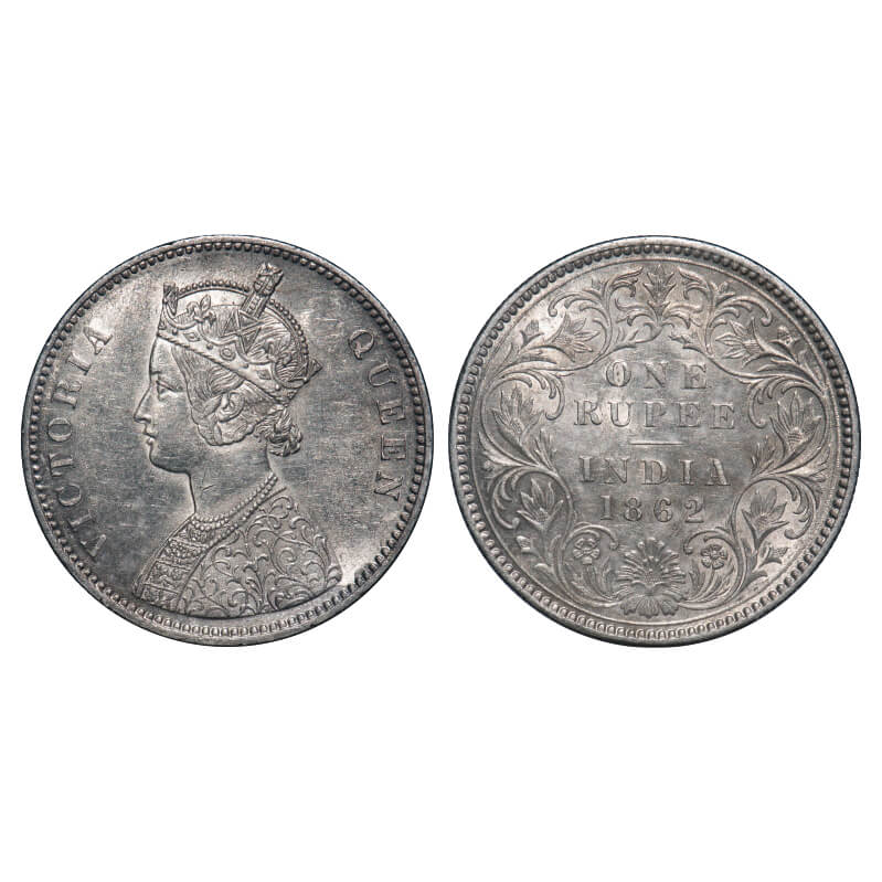 Victoria Queen, Silver, Rupee, 1862, Calcutta Mint, A/III, w/o initial 'J'. F. Prid 65. GK 254. About Uncirculated. Rare.