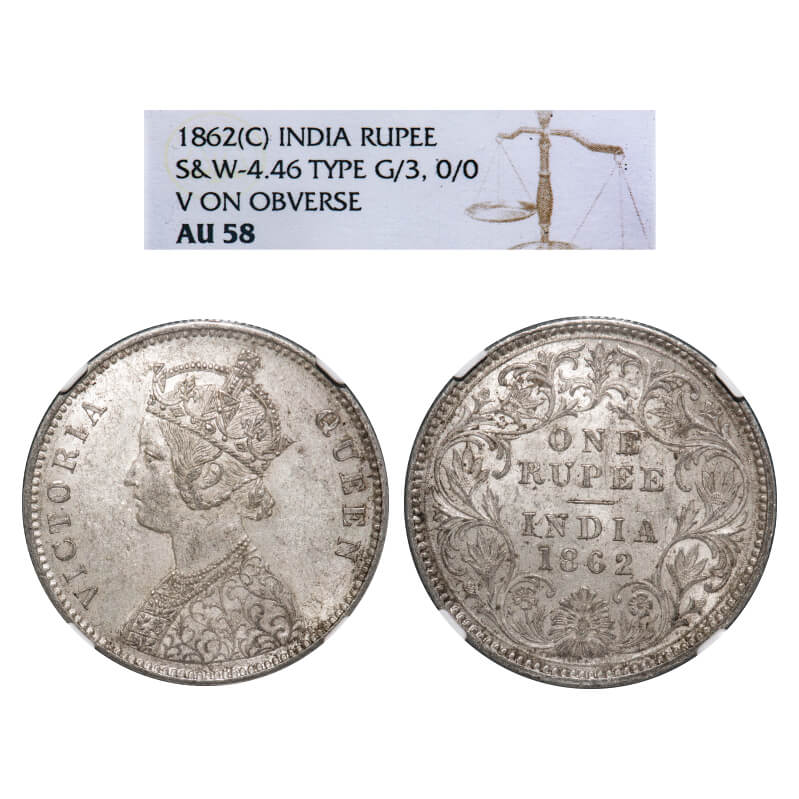 Victoria Queen, Silver, Rupee, 1862, Calcutta Mint, A/III, w/o initial 'J'. F. Prid 65. GK 254. NGC Slabbed AU 58. Very Rare.