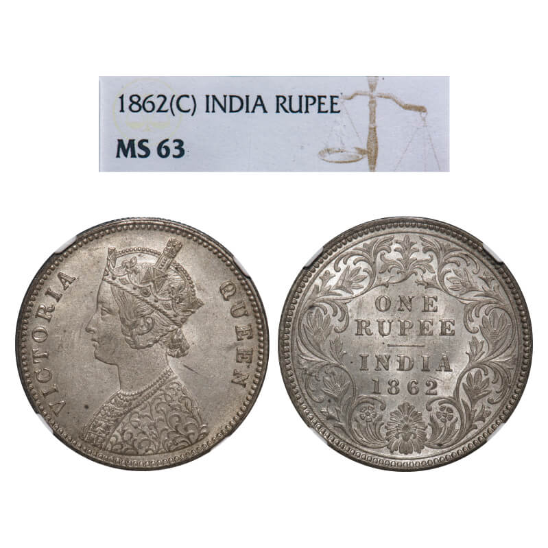 Victoria Queen, Silver, Rupee, 1862, Calcutta Mint, A/I, With initial 'J'. F. Prid 66. GK 255. NGC Slabbed MS 63. Very Rare. (31 coins graded higher by NGC in this category till 10/9/2025)