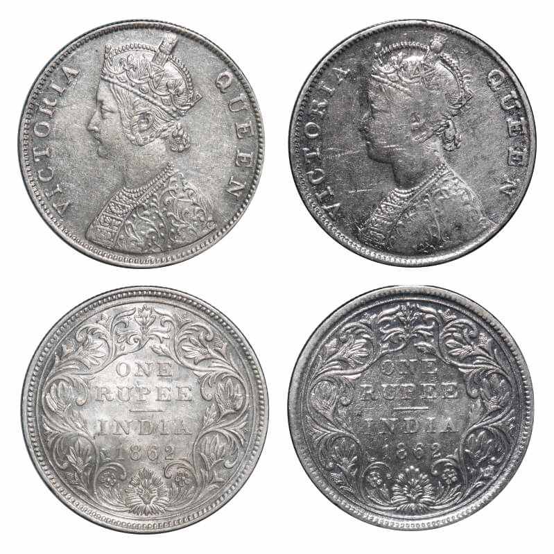 | Victoria Queen, Silver, Rupee, (2 coins), 1862, 1) Madras Mint, B/II, w/o enclosed frame effect, w/o re-engraving in hairs, 2) Bombay Mint, B/II. F. Prid 57, 58. GK 264, 271. Very Fine+ to Uncirculated. Rare. |
