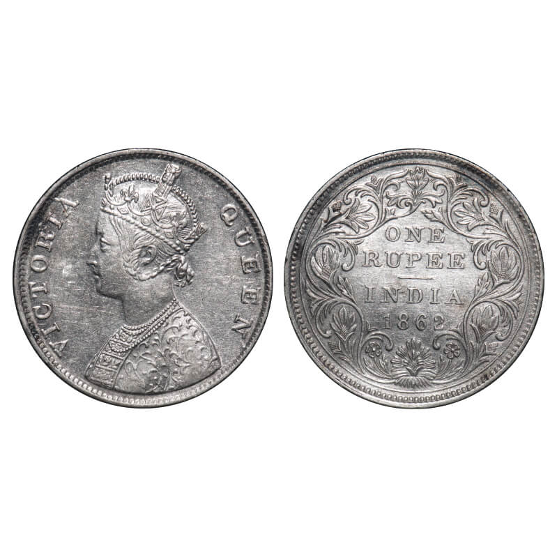 Victoria Queen, Silver, Rupee, 1862, Madras Mint, B/II, With enclosed frame effect and w/o re-engraving in hairs, Sharp elongated pearls on both the arches of the crown. F. Prid 57. GK 266. Extremely Fine+. Very Scarce.
