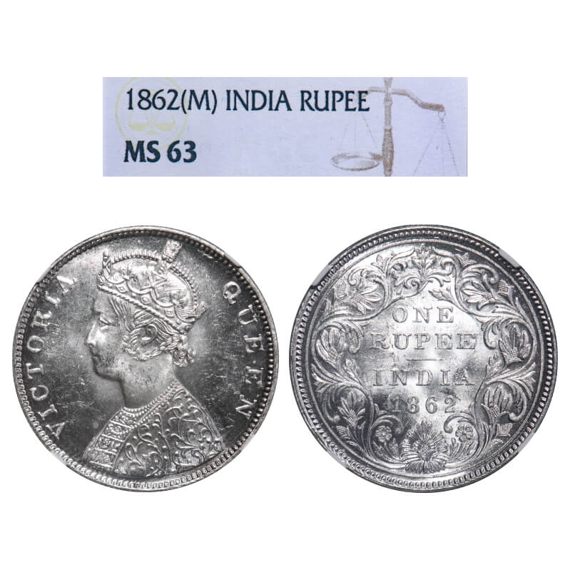Victoria Queen, Silver, Rupee, 1862, Madras Mint, B/II, With enclosed frame effect & with re-engraving in hairs. F. Prid 57. GK 267. NGC Slabbed MS 63. Extremely Rare.