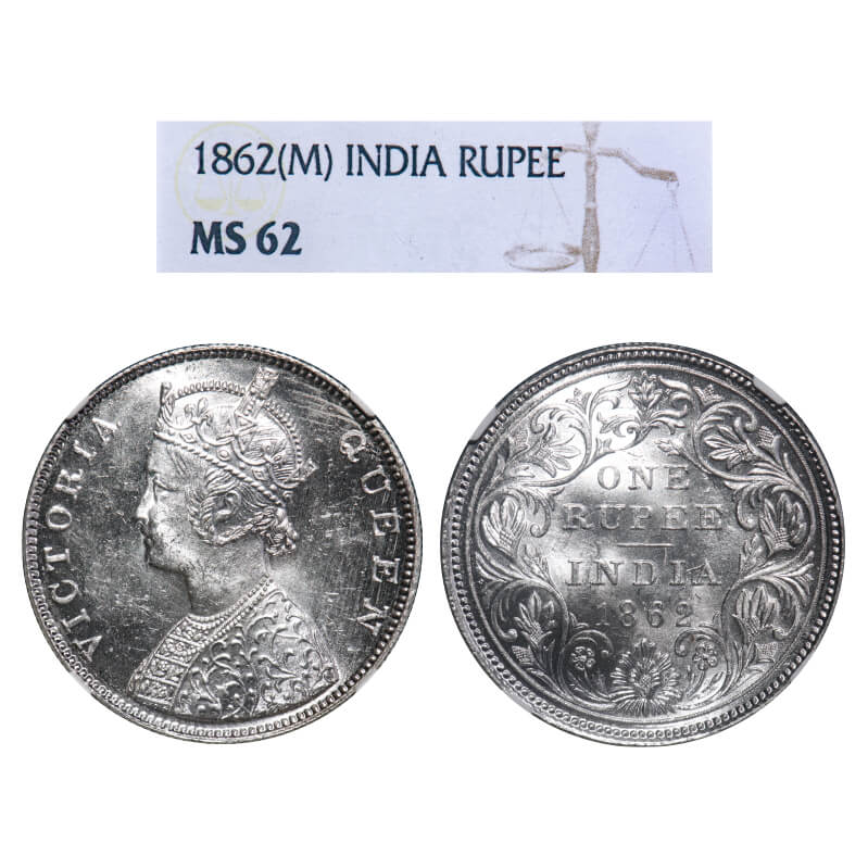 Victoria Queen, Silver, Rupee, 1862, Madras Mint, B/II, With enclosed frame effect & Embroidery retouched at some places. F. Prid 57. GK 268. NGC Slabbed MS 62. Very Rare.